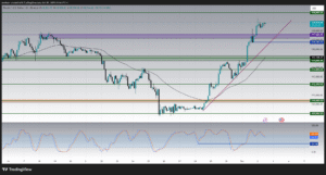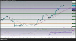 The uptrend remains firmly in place, supported by price action above the 50-period simple moving average (SMA) and a clear ascending trendline across multiple timeframes. Market momentum is strong, but indicators suggest short-term overbought conditions, raising the possibility of a consolidation before a decisive breakout.