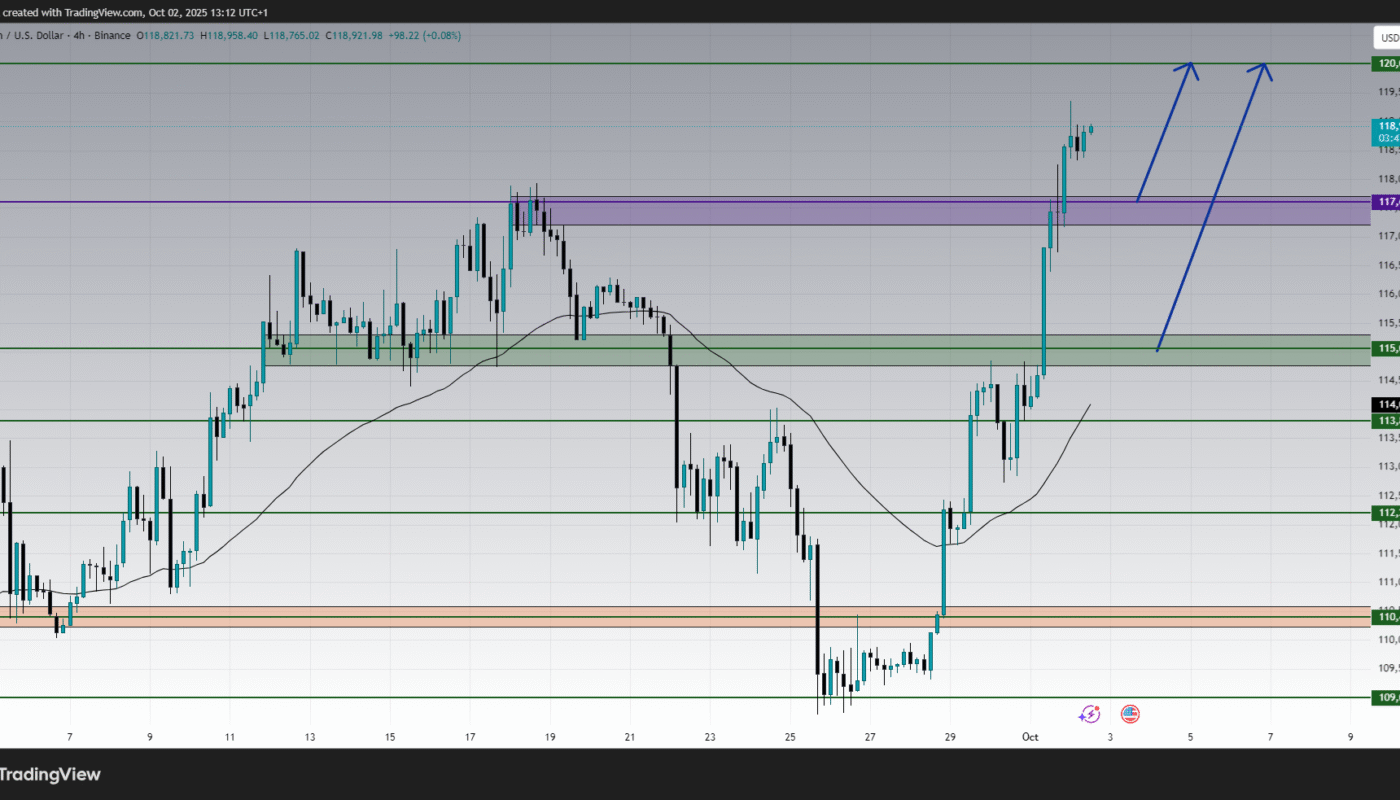 The 4-hour timeframe underscores the strength of the current bullish trend. Since bouncing from $109,000, Bitcoin has formed a textbook sequence of higher highs and higher lows. The breakout above $117,600 is particularly significant, as it clears a level that capped gains during September.