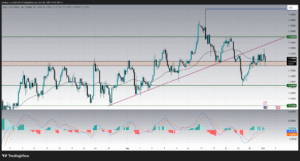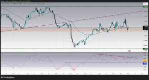 Looking at the 4-hour timeframe, EURUSD shows a broader consolidation between 1.1819 resistance and 1.1645 support. The recent failure to sustain gains above the 1.1760 zone highlights the strength of dollar buying interest. The MACD indicator is flat near the zero line, showing indecision, but the bias tilts bearish given the inability of buyers to push higher.