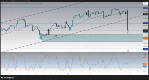 The RSI on the 4-hour timeframe offers additional clues. It had shown a bearish divergence: while price was making new highs or holding high ground, the RSI was failing to confirm and was drifting lower. Today’s sharp drop pushed the RSI well down (into the 30–35 zone), confirming that momentum has turned decisively negative.